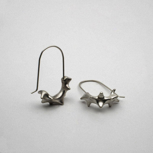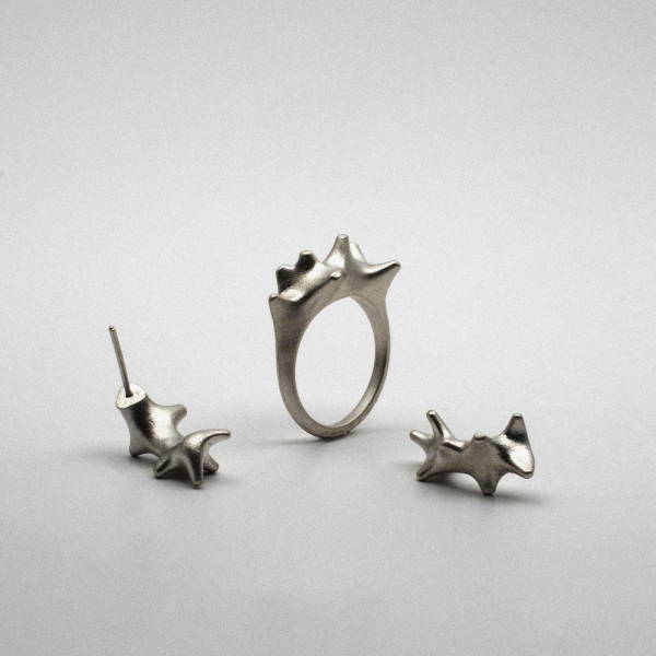Serie de piezas de joyería que surgen de la investigación sobre la tensión como principio estructural. Las formas iniciales evolucionan hacia volúmenes orgánicos que sugieren movimiento y transformación. Cada pieza representa una forma que parece estirarse y contraerse, como si tuviera vida.